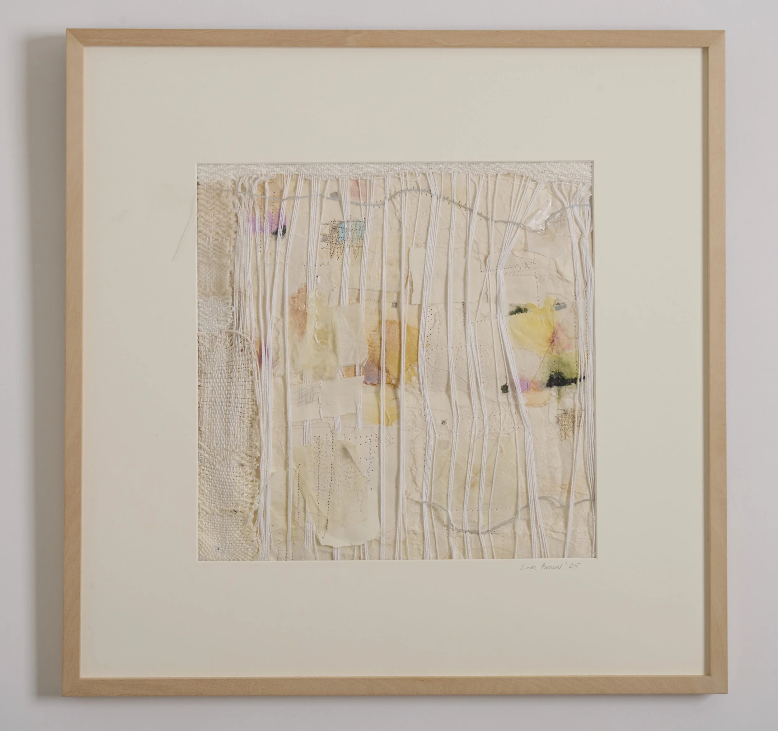 My collage work brings together dyes, paints, handmade papers, and stitched elements. I often incorporate textile techniques—both machine and hand sewing—allowing fibers and threads to become graphic lines, textures, and structural components.